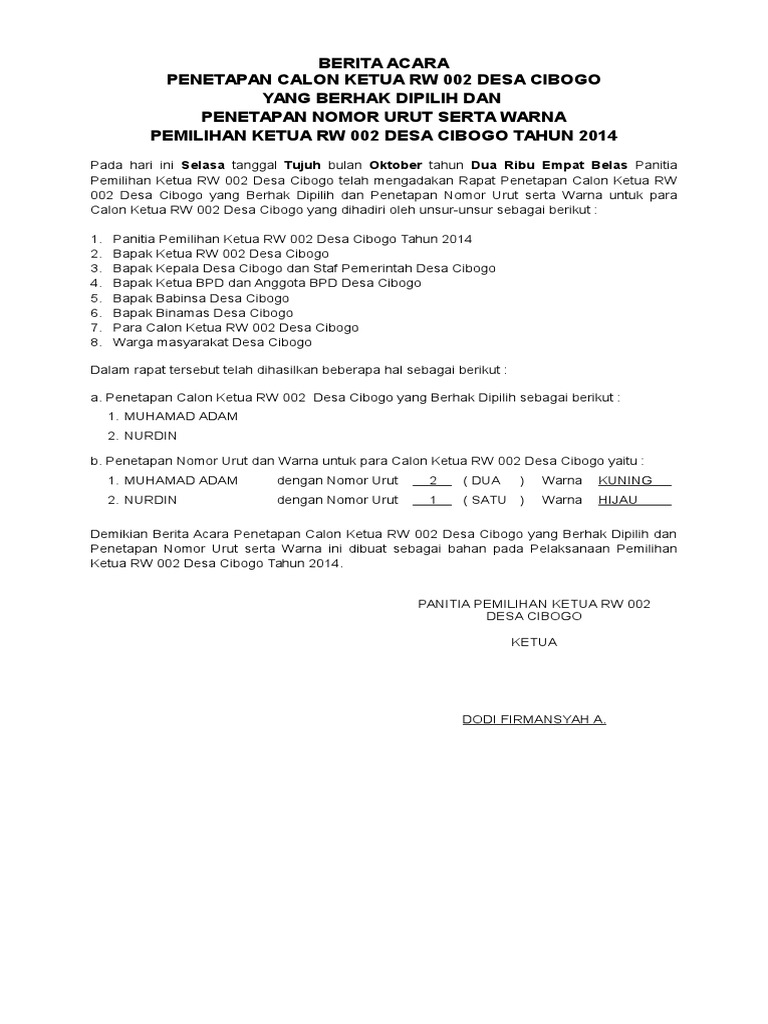 Demikian berita acara kompensasi penggalian tanah saluran limbah perumahan bumi. Berita acara pembentukan panitia doc. Contoh berita acara serah terima jabatan ketua rt. Berita acarapemungutan dan penghitungan suarapemilihan ketua rt. Contoh surat yang satu ini biasanya akan dipergunakan oleh perkumpulan ataupun mewakili kelompok tertentu. Contoh surat undangan pemilihan ketua rt rw untuk menghadirkan warga atau pemegang hak suara pada tps dengan waktu dan tempat yang ini adalah contoh tata cara pemilihan ketua rt dan ketua rw di lingkungan saya berada, jika dilingkungan anda ada yang ingin meniru sebaiknya. 15 contoh surat berita acara untuk berbagai keperluan download serah terima barang tanda dokumen wood scribd indo pemberitahuan. Contoh berita acara pemilihan rt. 10 contoh surat edaran dengan penulisan yang. Surat pemberitahuan merupakan salah satu sarana. Berita acara banyak dibutuhkan di berbagai waktu dan kondisi, maka surat ini memiliki berbagai jenis dan fungsi yang berbeda pula. Contoh surat pemberitahuan kegiatan kampus seminar workshop. Pemilihan langsung ketua rt 007/08 kel.